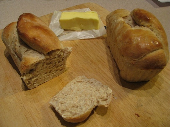 18. Remove from oven and allow to cool slightly; removed from pan and rub top of loaves with butter or margarine. Let cool before slicing.