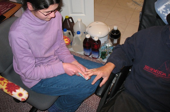 G. works on messaging, then buffing, out Fino’s nails. Not pictured, but also enjoyed by Fino tonight, was the honey souffle mask made with egg white, honey and lavender oil.