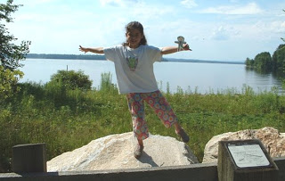 L., the Almeida Fam’s Flat Stanley creator, imitating her drawing at Sebago Lake the year she drew it.