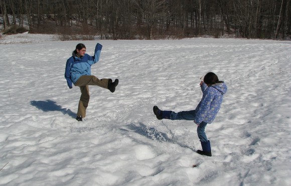 We saw a fast-moving spider in a snow-free patch of marsh but G. wasn’t fast enough with the camera to catch him. But there is still snow around so spring isn’t here quite yet. The girls had a little fun kicking it around to relish the last few days of this favorite seasonal activity.