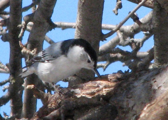 We spotted a white-breasted nuthatch during our visit at Gilsland Farm Audubon Center on Sunday and G. determined with the zoom lens of the camera that it was a male bird (the males have black on the top of their head, females have a grayer color). L. confirmed this sighting with her reference book and binoculars as well. The girls have this tag team thing going with the Bird Identiflyer, Peterson’s Guide, binoculars and family camera. They take turns with the various birding “equipment” and it keeps us all entertained.