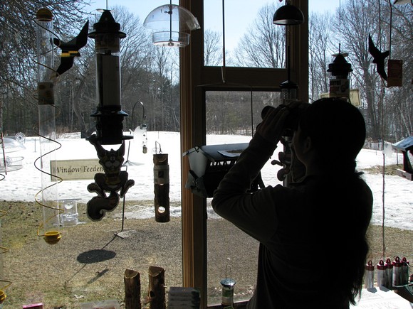 The girls had been begging to go back to Gilsland Farm since our trip last month. I am aware it is kind of silly that we drive all the way to the Audubon Center to watch their bird feeder. Our own at home sees plenty of action but the girls think there are more interesting birds in Falmouth. Oh, and did I mention they like browsing in the gift shop there too? During this trip, G. and I asked some questions about the store’s binoculars (the prices range from under a hundred dollars to several thousand). We learned quite a bit about the power of magnification numbers and size of the lens from the very helpful and friendly clerk at the store.