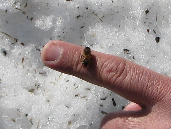 We did not spend all our time in the gift shop or sitting at the picnic tables watching the bird feeder however. We did actually do a bit of hiking around the farm. It was sunny and warm (relatively speaking for March in Maine of course) and we saw plenty of signs that spring is coming. The Audubon Center has some bee hives and they were active with little guys flying around and Fino managed to encourage one to land on his finger.