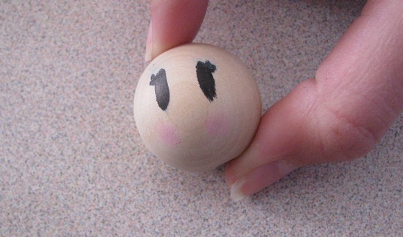 6. For the head, hold the wood apple upside down with the widest part at the bottom. Apply powder blush (with cotton swab) to the cheeks. Use the black marker to dot the eye. Glue head to the top of the spool.