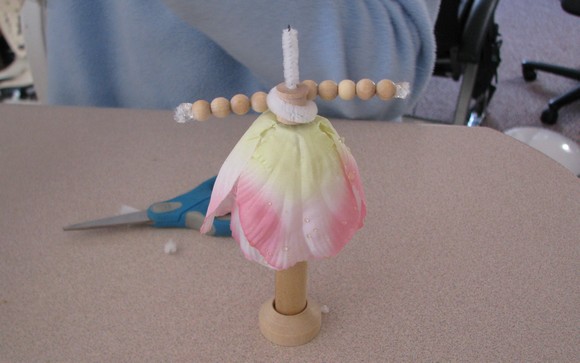 5. Glue small petals or leaves over spool for bodice. Spot glue at front and back. Glue leaves or petals to the back of spool for fairy wings.