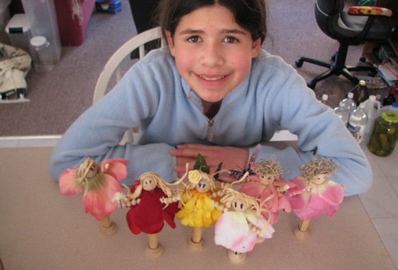 L. suggested I share the step-by-step directions to make these flower fairies here so other kids can make them. She also did a demonstration on how to make these fairies for me to record and post on YouTube (see below). But here are a few snapshots of the making process (materials list and written directions below).