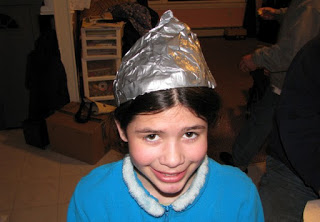 L. has been making headgear out of duct tape and having a ball with it (she was inspired to do this after taking a 4-H workshop). The only downside to this craft project for L. has been ripping the tape. She was sporting several band-aids over small blisters on her fingers from all her ripping action last week. But after seeing her many creations, it’s no wonder her fingers have been sore. She designed a wide variety of hat styles for everyone in the family.