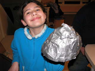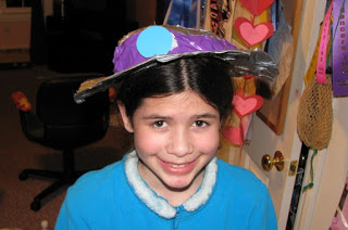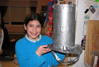 Duct tape is not particularly cheap when you buy a bunch of different colors but she made all these hats with one regular roll of tape so it does last quite a while (she used recycled cardboard and/or piece of poster board as the base for some of these hats). But I think the entertainment value was worth the $3.50 I paid for that first roll of tape. Anyone else ever make projects with duct tape? L. got a few ideas from the Duct Tape Club but she was wondering what other kids like to make with the stuff.