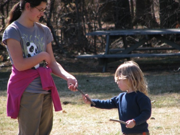 One of our little friends (a younger sibling to a club member) offered G. one of his precious sticks while she had to stand as a place marker for a drawing. It was really sweet.