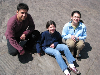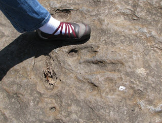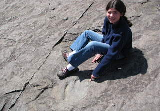 L. was really curious about the footprints and decided to get a feel for the stride of the dinosaur who made it. Her hypothesis was that the dinosaur who made these particular prints was probably running.