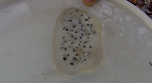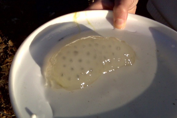 L. was a little nervous sticking her hand in the water to touch all the slime (the jelly-like substance helps protect the growing eggs but it takes some getting used to handling it) but she got over that pretty quickly thanks to my white MaineToday frisbee, which we used it to gently scoop up egg masses as the UMaine researcher suggested and it worked great.