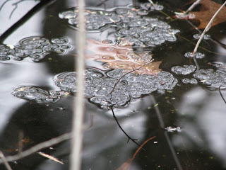 G. was our research photographer (i.e., she wasn’t so keen on sticking her hands in the water) and took some nice shots at the vernal pool, including this one of the wood frog egg masses at the surface of the water.