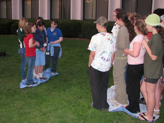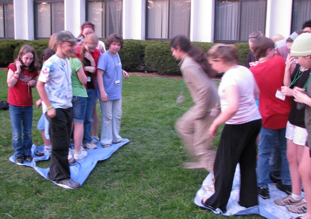 One of the team challenges was to get each team’s blanket (which they were standing on) flipped over on to the other side without anyone stepping onto the grass. There were more than 10 kids standing on each blanket so initially it seemed very un-doable. Then one of the kids suggested that one team jump on the other team’s blanket until only a few remained to flip their blanket over and then reverse the process.
