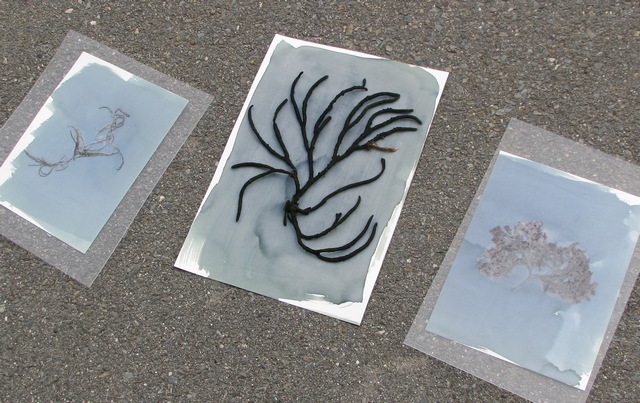 Sun prints setting outside. This requires about 15 minutes of direct sunlight on photo-sensitive paper. The prints are then “developed” like a regular photograph to create the final print.
