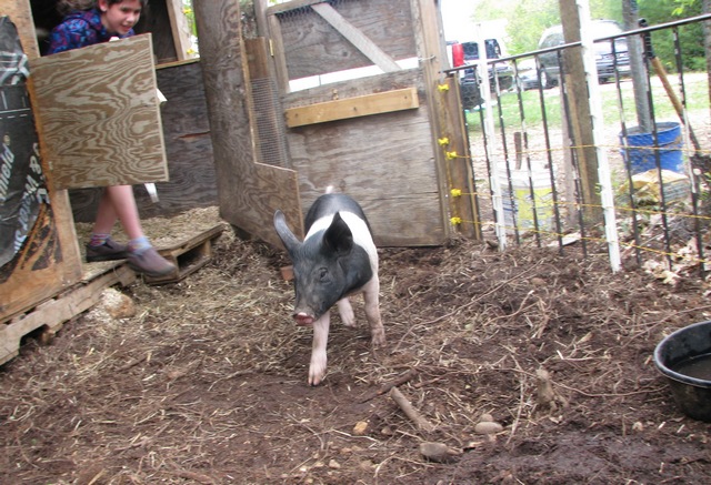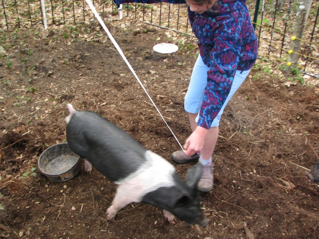 L. really has been taking good care of her piggies but she is starting to realize how much she’s going to have her hands full as they continue to grow. Because not only are the pigs fast on their feet, they’re great strategists for games of tag (aka “measure the pig”). All I can say on this subject is that I’m darn glad we’ve got the electric fence because the prospect of these guys getting out of their pen and running around the yard is daunting.