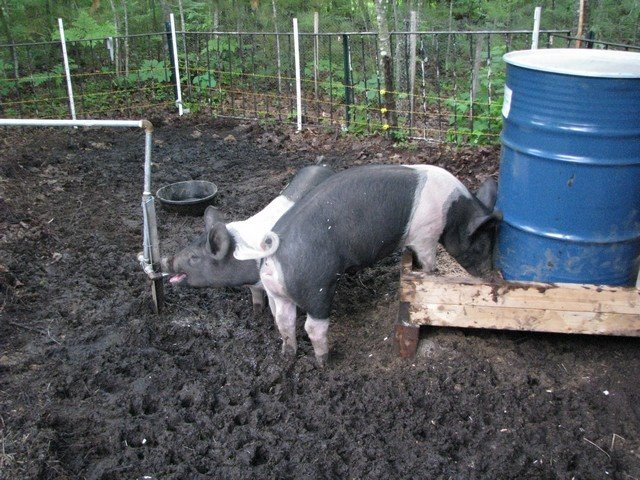 To avoid all the spilled water dishes that make the mud even juicier, he installed some reinforced pipes (protected by a 3-foot stake in the ground) for water spigots that release water when the pigs nibble on them (it’s nice they have something other than my butt to bite).