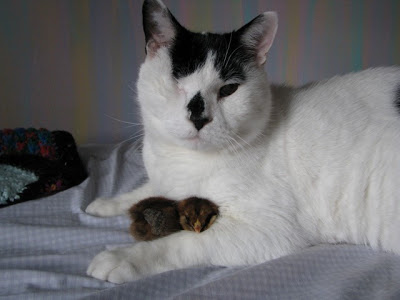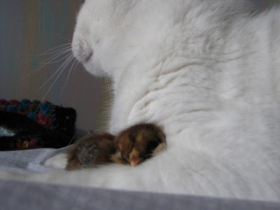 The girls are chick-sitting for the next couple of weeks and it turns out that Toddy our blind cat has become a daddy, or so one of the baby chicks thinks after she snuggled in to Toddy’s fur for a snooze yesterday.