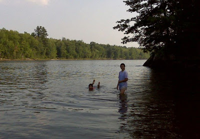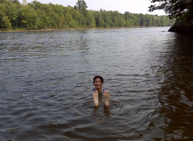 The kids took her suggestion (our research on leeches last year confirmed that leeches do NOT like sandy areas, mud is where they hang out) and after discovering the sand bar was quite large, decided they were so hot that taking a quick dip would “probably be OK.”