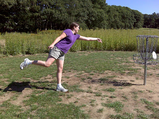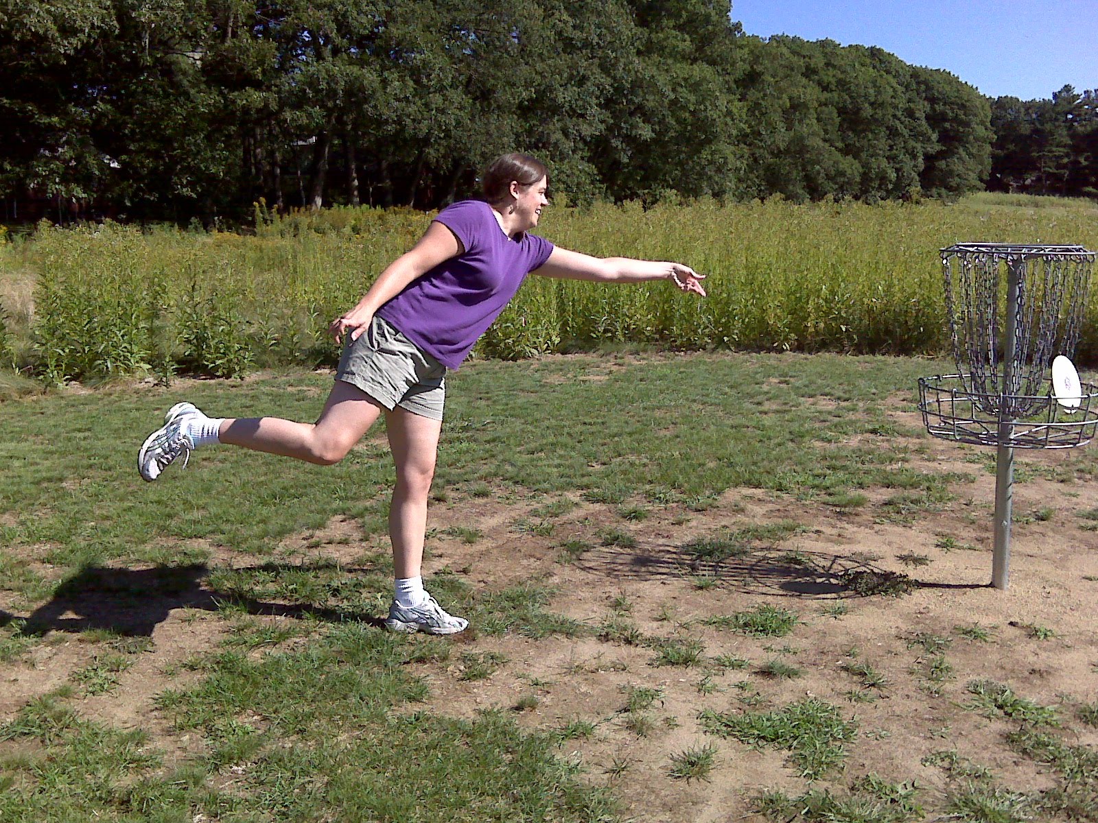 The girls were mighty amused at my disc golf throwing on the Pleasant Hill course in Scarborough last week. I have a tendency to fling my leg out when I throw my disc and there’s not much finesse with my technique. But, it gets the job done. My disc usually flies a good distance (although not very accurately) down the green.