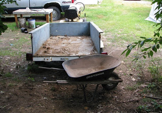 Learning #2: Don’t ever say, “This is the LAST time I’m dumping sand in to this pen.” Those words will bite you in the you-know-what (raising pigs has a tendency to do that) and you’ll find yourself deciding one more time really is necessary. But in the spirit of ingenuity, and sheer discouragement at this necessity, Fino rigged up our trailer to the lawnmower tractor. Gathering and dumping sand was done with much more efficiency and we both wished this idea had come about earlier this rainy summer.