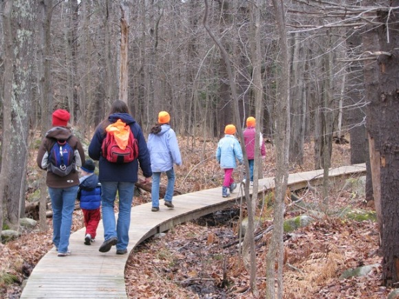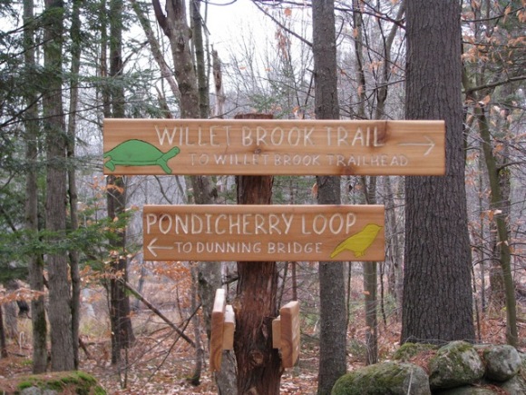 Note-able: The trail blazes/markers are wooden cutouts with different shapes and colors to identify trails. All the kids commented on how much they liked these markers, especially the “yellow birdie” on the Pondicherry Loop. The Stonewall Loop trail was identified with a reddish leaf cut-out and the Willett Brook Trail was a green turtle. Also, the stone fireplace on the Willett Brook Trail was a special treat for the kids to explore.