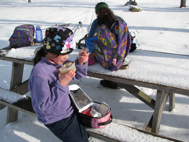 Whether we are on skis, snowshoes or simply taking a short walk in the woods in regular boots, planning a picnic out in the snow-covered woods is a seasonal highlight. We usually pack a nylon blanket to keep our bottoms warm, along with sandwiches and thermoses of hot cocoa. The winter woods are a peaceful escape from the hustle and bustle of our daily life. Plus, the kids think it’s a special treat to go on a winter picnic since it’s not something a lot of other people do during this season. And animal tracks are abundant in the snow, which makes speculation about animals near our picnic spot enjoyable lunch conversation.