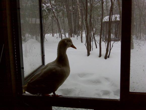 The only one undecided about going outside today was our ducky friend, Quackers (no ski goggle options for him). He perched on the frame of the coop’s door for a long time before venturing out to “swim” his way down the path (the snow was deeper than his little legs and it really did look like he was swimming) and back into the coop.