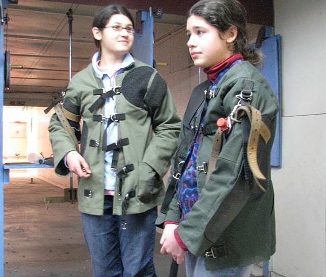 All year the girls’ shooting sports 4H leaders (they have several) have suggested they try shooting jackets but each time they refused. These jackets are widely used by target shooters of all levels because they help stabilize the torso and arms to improve accuracy. The jackets are snug and have shoulder and elbow pads to help steady and cushion the shooter. There is also a sling that attaches to the arm of the jacket as well that helps steady the arm even more. Nearly every boy in their club wears a jacket but the girls have always passed the rack with a quiet (and amused) comment to me that “the boys like their accessories.”