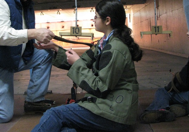 G. getting some instruction on the strap attached to her shooting jacket.