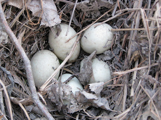 The mama duck actually scared the bejesus out of us when she took flight less than three feet from us. L. was quite indignant when we found this nest afterward, “What kind of mama duck is she leaving her eggs like that!”