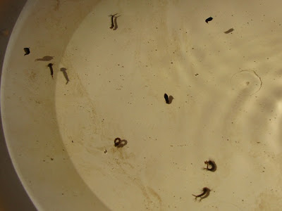 The small round creatures are tadpoles, the longer thin ones are mosquito larvae.