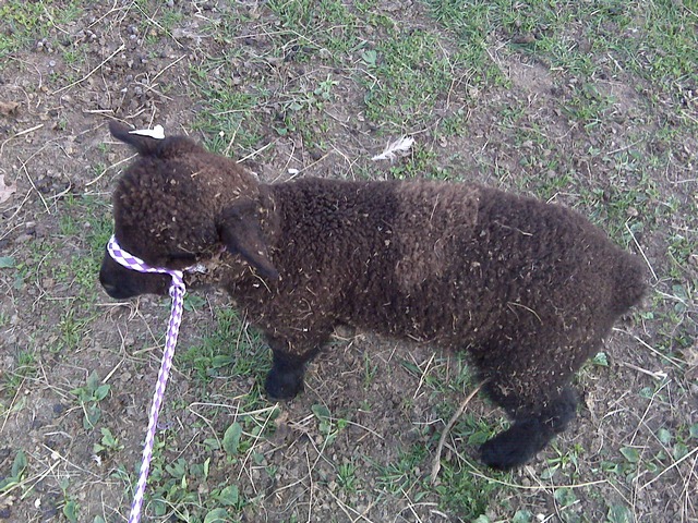 Symphony is dark chocolate brown with a couple of lighter patches of brown on her back and neck (which has been very handy when trying to pick her out of the flock of Romney lambs). This coloring prompted L. to think the lighter spots looked like the toffee chips in her favorite chocolate candy, Hershey’s Symphony Bar.