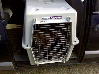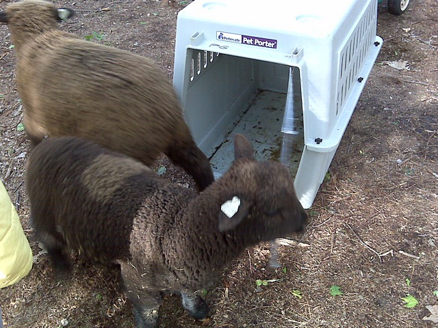 The lambs arrived via dog crate. The ride was a little tight for them but it was only a 10 minute ride from their farm home to our backyard and they seemed no worse for the wear in the close quarters.
