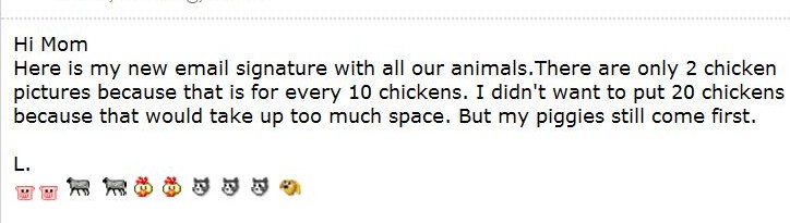 L. figured out how to create signatures on her email account a while ago and since she’s such a fan of pigs, she used two pig icons in her signature when she first set up her account.