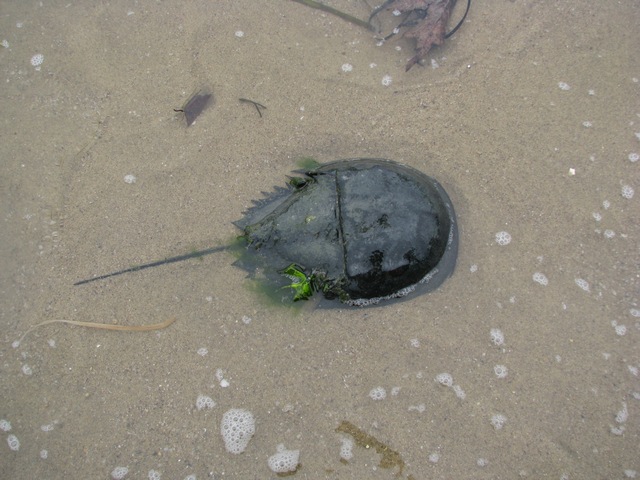 The horseshoe crabs typically arrive looking for some action … errr, mates … with the full moon’s high tide in May. Then they usually hang around the beach until mid-June.