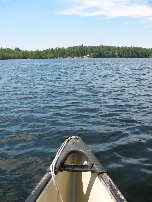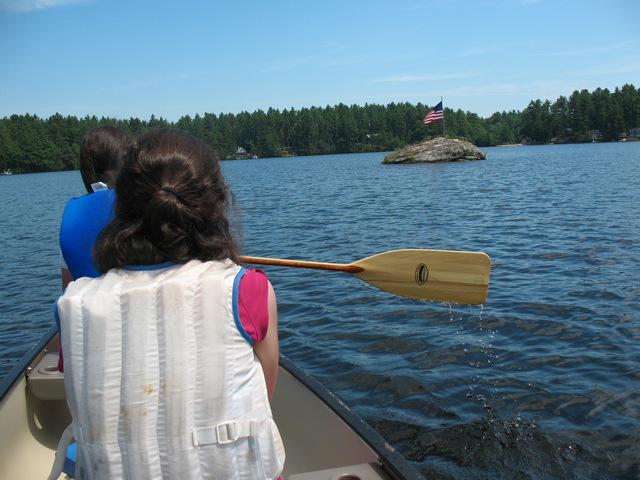 We found that a morning weekday in the summer had light motorboat activity (but quite a few kayakers), so we pointed our canoe to cross the lake so we could check out a large boulder with a waving American flag.