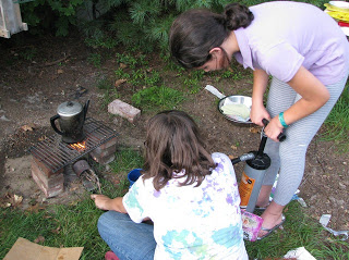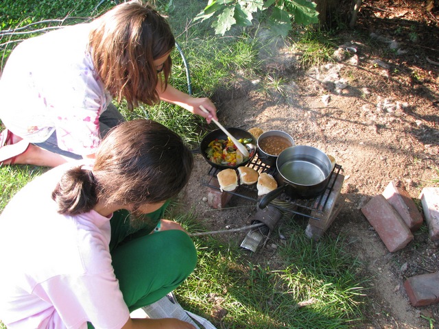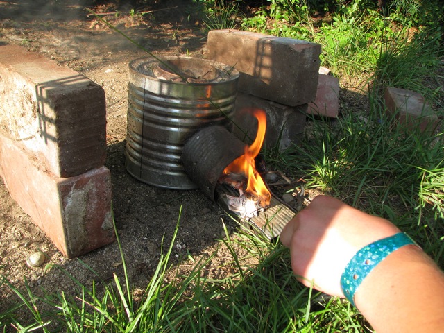 The indoor sleepover planning meeting also included the girls deciding to spend a couple of hours watching survivalist videos about building a shelter and a “rocket” stove. They didn’t end up building a shelter (L. wanted to see the stars) but Fino helped them with the stove – fashioned out of old tin cans, a couple of bricks and a recycled barbecue grate. It was actually quite cool.