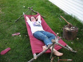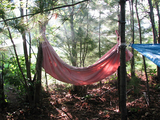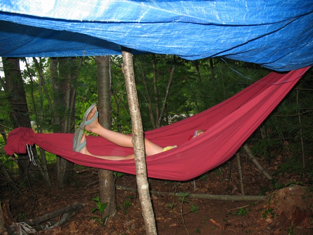 They also made a cot from logs and an old sheet but then decided hanging hammocks in the trees sounded better (and was much simpler to make).