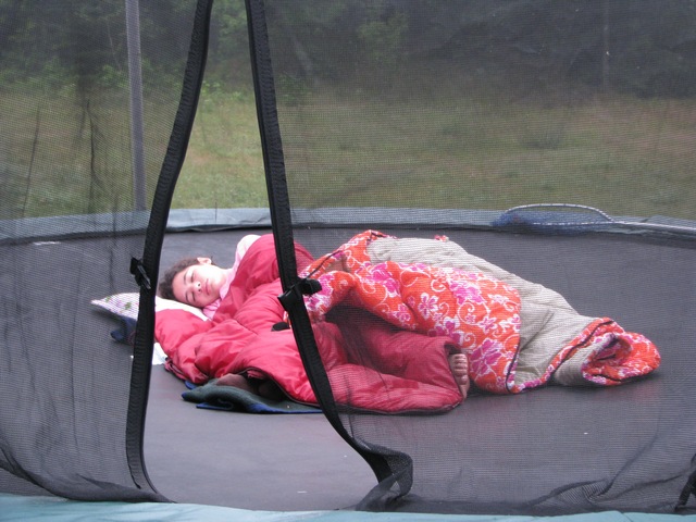 But the girls deemed their test run a great success with one exception – the hammocks. After a couple of repairs in the dark, the girls decided the trampoline would be much more comfortable – and reliable – to sleep on. And based on the original motivation for doing this in the first place – sleeping outdoors under the stars without a tent – the trampoline qualified.