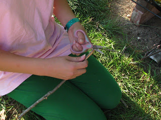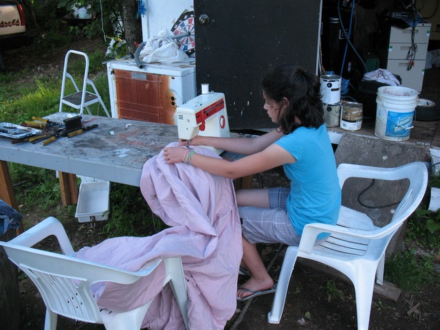 The girls gathered all their supplies on the day of their test run that included their rocket stove, composting toilet (i.e., bucket with wooden seat and shavings on the bottom from the sheep’s supply – another “living off the land” example you ask? it is when you’re 12), hammocks made from old sheets, a full cooler of water bottles and milk and various kitchen ware to prepare and eat the food. And thanks to a recent gift from grandma, a privacy tent for the camp’s bathroom which included the composting toilet AND shower (i.e., water bag with shower head sprinkler tube).