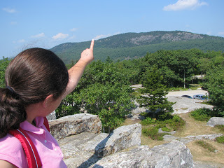 The tower at the summit of Mount Battie reminded the girls of the one on Douglas Mountain in Sebago. And the panorama display at the base of the tower identifying the islands in Penobscot Bay was helpful, since we had wondered while at the top of Mount Megunticook about the various islands we could see from there.