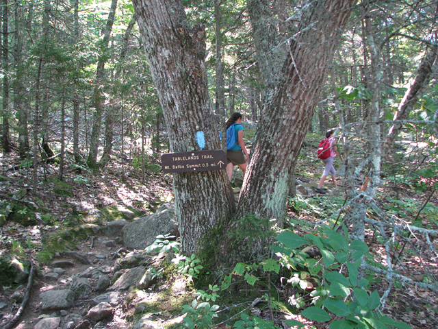 After lunch and lots of water, we were feeling refreshed and decided to hike to Mount Battie. We took the Ridge Trail back to the Tablelands Trail, which led us to the Mount Battie Trail. When we found ourselves at a paved road, we were initially confused about how to proceed until we saw the trail blazed on the pavement. The trail headed back into the woods and we made our climb, a much easier elevation gain of only about 200 feet, to Mount Battie.
