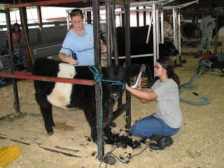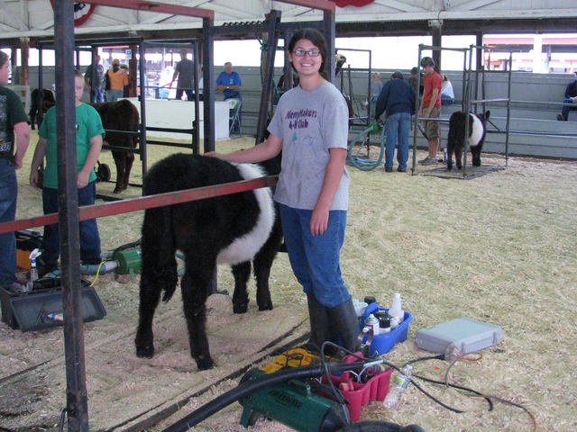 So her 4H leader and several other people suggested G. and her friend L. participate in the clipping contest that morning. The contest involved grooming and clipping a small calf as if they were going to show it at the fair. The girls ended up with a young Belted Galloway. This little “belty” had long hair and required a different sort of grooming job than the usual Herefords the girls were used to working with. But they went right to the task and by the end of it, G. had forgotten to be nervous about showing Bailey because she really enjoyed grooming and clipping the belty.