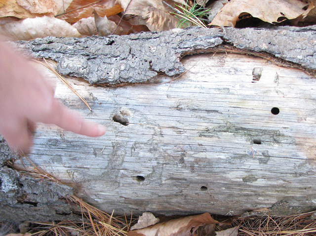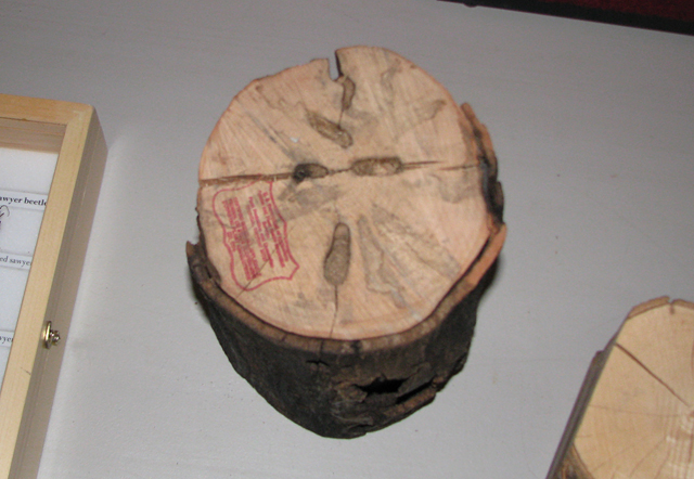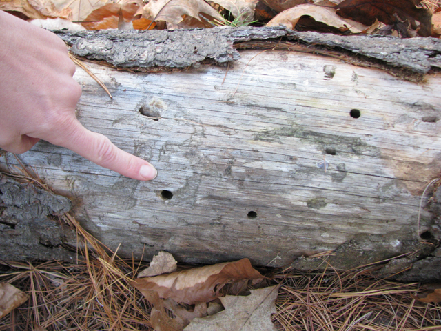 - CLARIFICATION: Our instructor for this class, Anne Bills the Invasive Forest Insect Outreach Coordinator from the Maine Department of Agriculture, offered a clarification for the above holes you might see in a tree in Maine and I wanted to make sure I posted it. “The holes in the photos really do look just like ALB damage, and the reason we can rule out ALB is that it is softwood (coniferous), which ALB doesn’t attack. If the logs were hardwood that type of damage is exactly what we would like people to report, even though it does not necessarily mean the damage would have been from ALB (could be from native hardwood borer). I did not hear the comment about the rectangular holes, but I really do think it would take an expert to tell the difference.” So people should report holes like this if they see them in Maine!