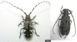 The ALB is on the left, the white-spotted sawyer is on the right. Photos from maine.gov ALB Look alikes page