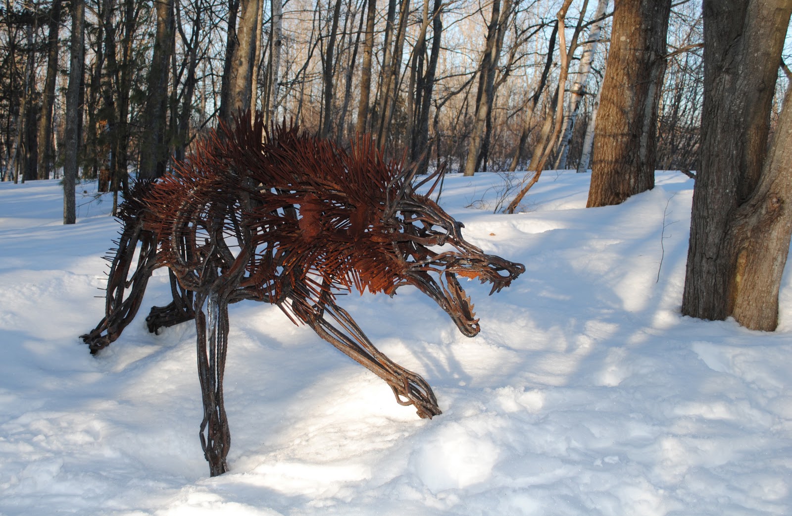 The sculptures are metal works of caribou, mountain lion, deer, lynx, porcupine and wolves — all creatures common to Maine, either now or in the past. The work is striking in the winter environment due to the lack of foliage and well worth a hike through the woods here to see them all.