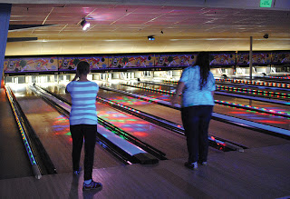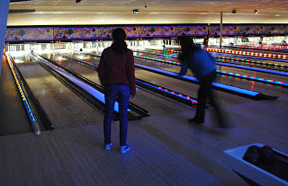 On our way out my 13-year-old noticed the “regular” bowling alley with its traditional lighting.