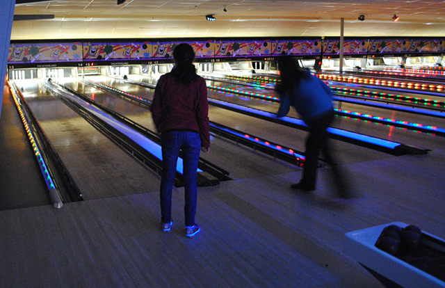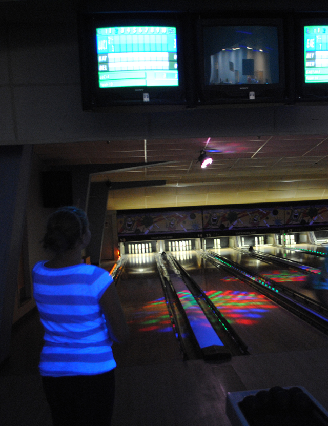 On our way out my 13-year-old noticed the “regular” bowling alley with its traditional lighting.