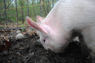 Yuki, the white, turned pink, now back to white pig who is in hog heaven when outside rooting.