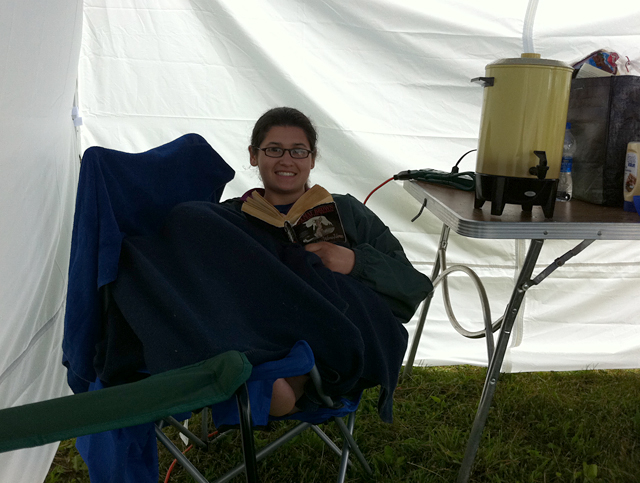 G. hung out reading her book rather than brave the downpour in our EZ-Up shelter. Those tarp sides are worth the investment when you know you’ll be dealing with rain. Also note the hot water pot. It was a $3 investment from Goodwill I am so happy we brought it along. Hot cocoa and Ramen noodles are now a staple for future camping trips.